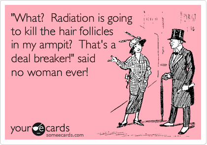 1. The only thing I got with radiation was a major sunburn. On the bottom side of my left boob so it laid on itself. Ouch. But it was towards the end so didn’t have to deal very long and they gave me a good cream.