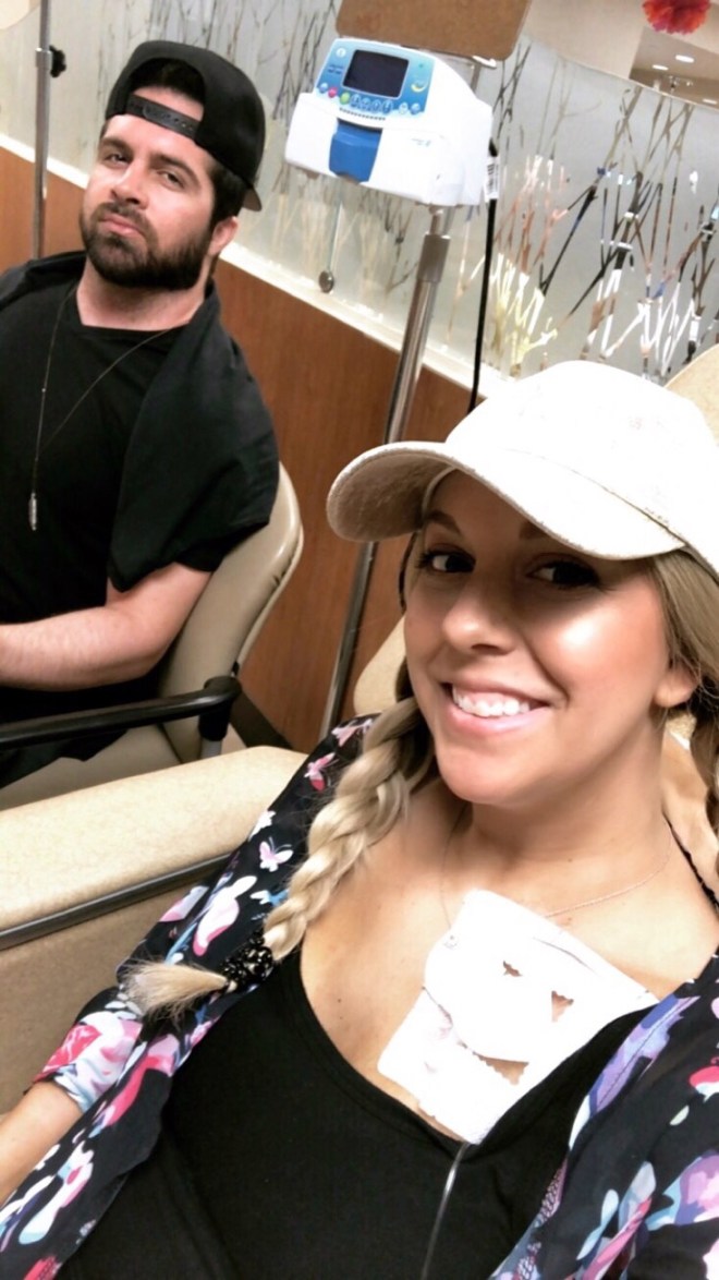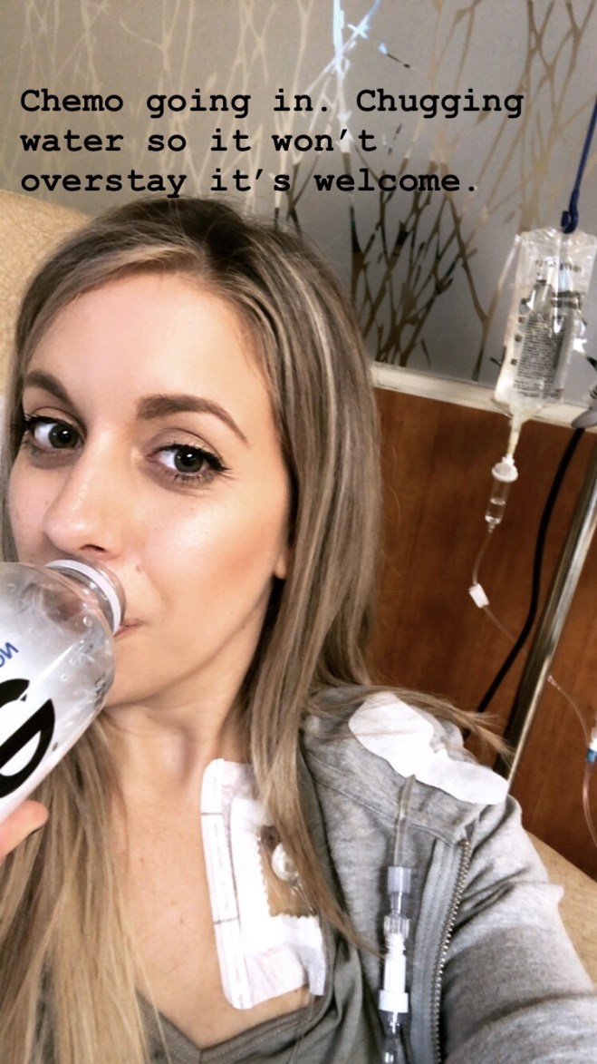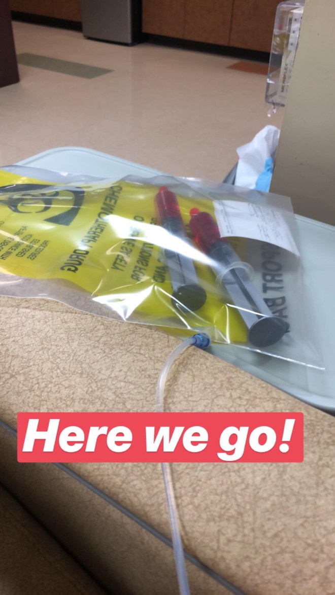 I met my sweet nurse Ashley who was so amazing. She made me feel so at ease. They hooked up the pre meds to my port and just like that the process started. I started out getting a cocktail of nausea meds and steroids. Last she gave me a shot in my stomach that helps prevent nausea for 5 days. Then came the bad boy. The “red devil” they call it.